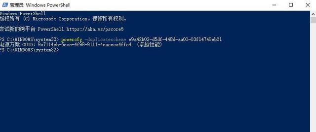 嫌麻烦的同学也可以直接粘贴复制,非常方便。回车以后,如果你的电脑显示的是电源方案 GUID: 9a7114eb-5ece-4f98-9111-4eaceca4ffc4 (卓越性能)。那么恭喜你,Windows 10的隐藏性能模式被你开启成功。