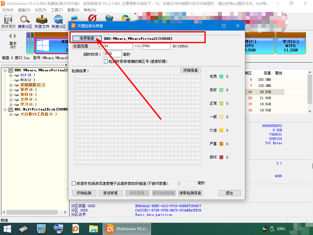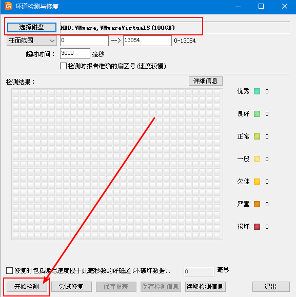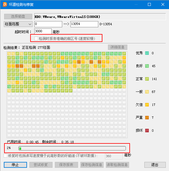 8、 检测时间较久,请耐心等待,检测完毕后,检测显示坏道时,点击【尝试修复】即可