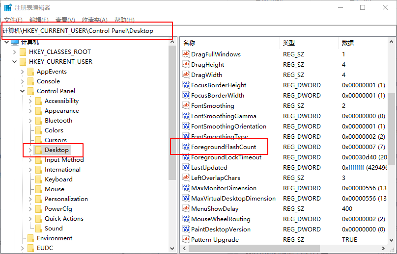 3、在右边找到ForegroundFlashCount,没有的话就手动新建一个DWORD(32位)值,命名为ForegroundFlashCount,如下图;