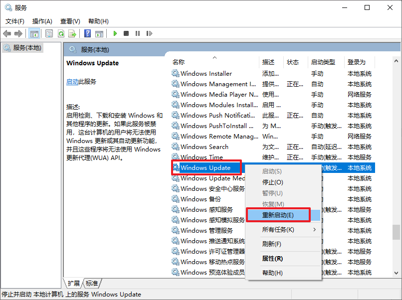 4、随后,在服务页面中,再次右键“Windows Update”,选择“重新启动”