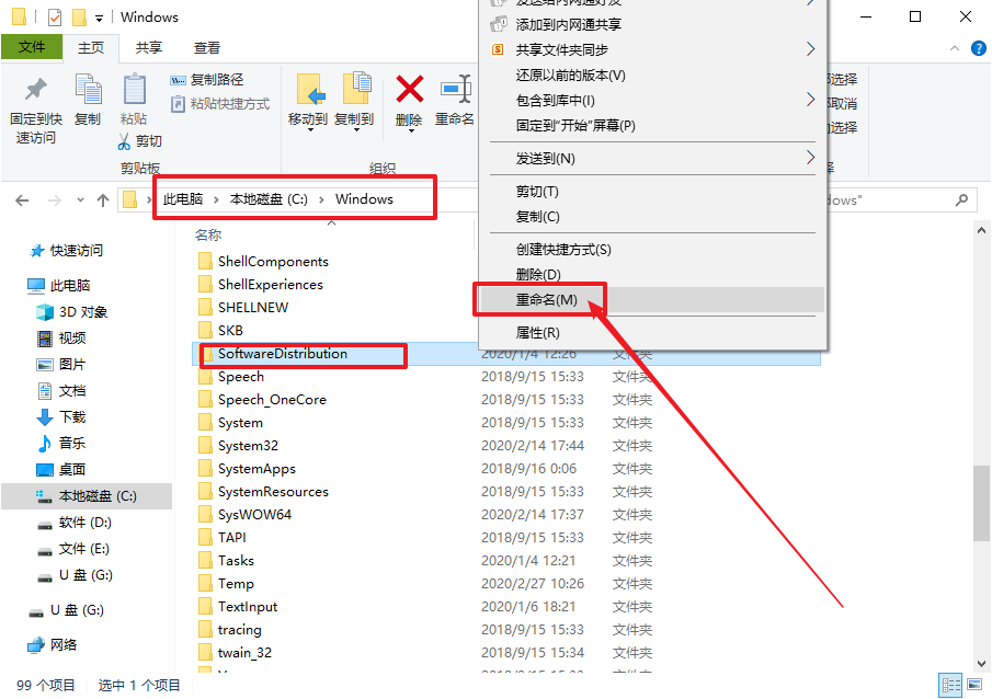 3、 之后,打开此电脑,依次打开“C:\Windows”,并将Software Distribution文件夹进行重命名