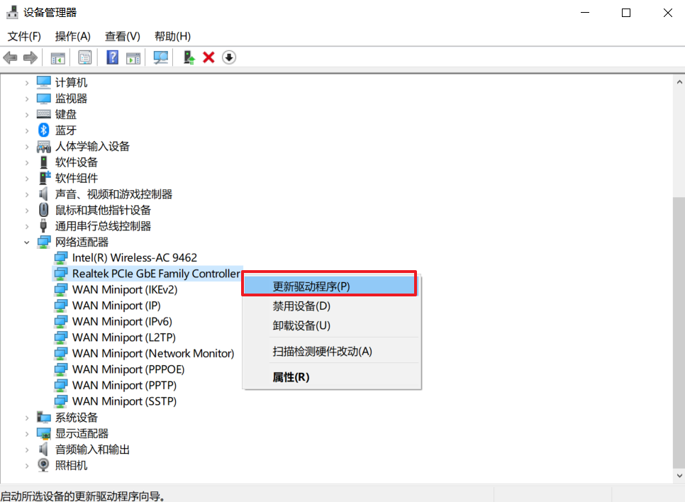6、 扫描完毕之后,右键之前卸载掉的网络设备,点击“更新驱动程序”