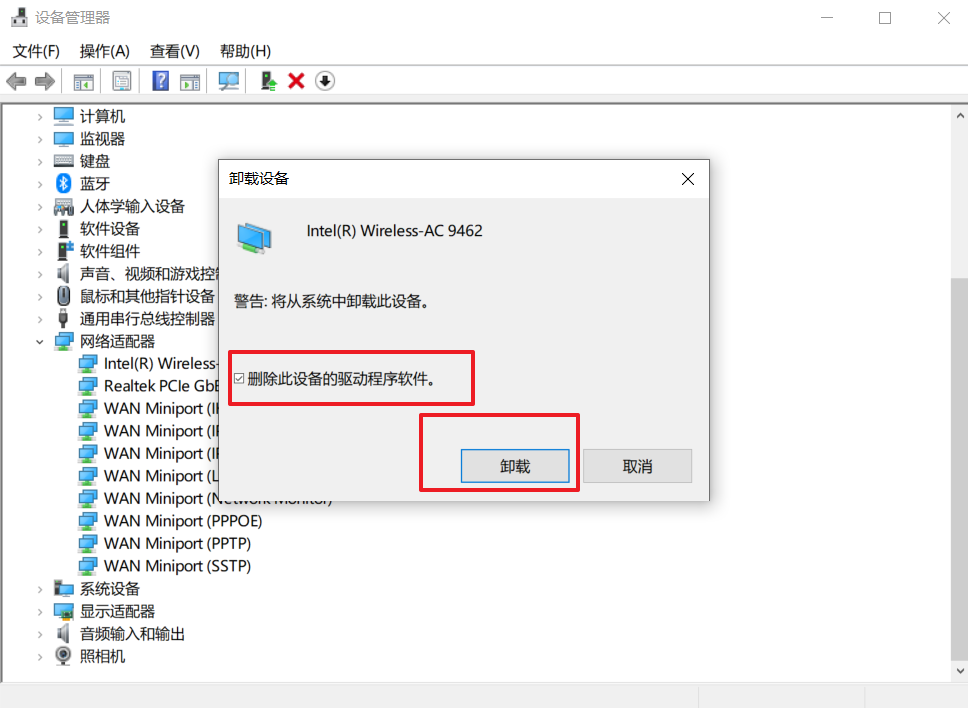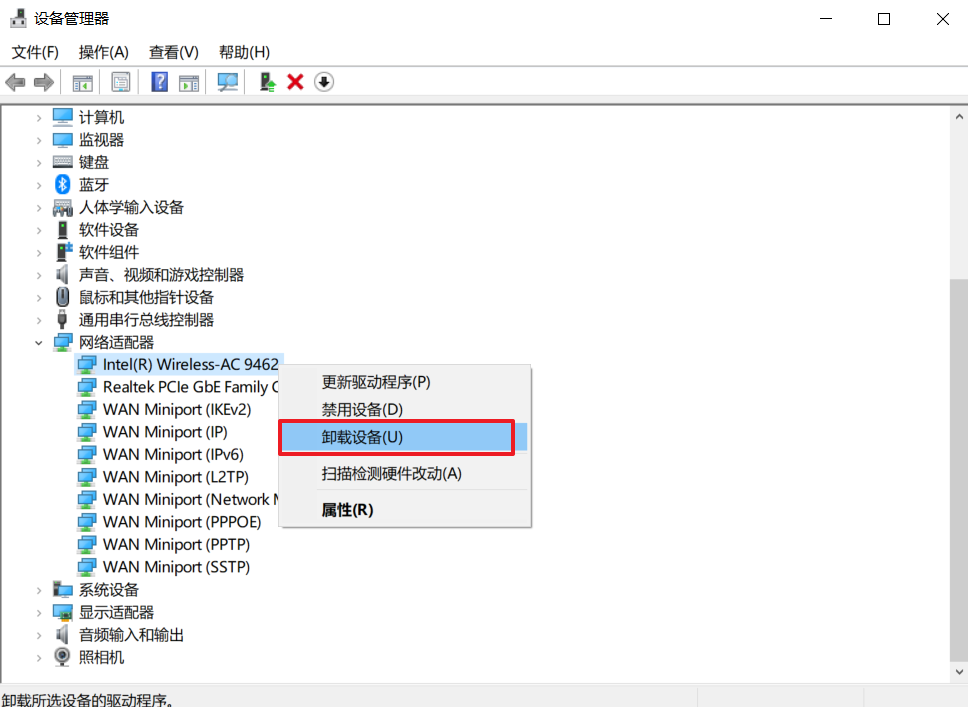 3、 在设备管理器页面中,点击展开网络适配器,右键你正在使用的网络接口,点击“卸载设备”
