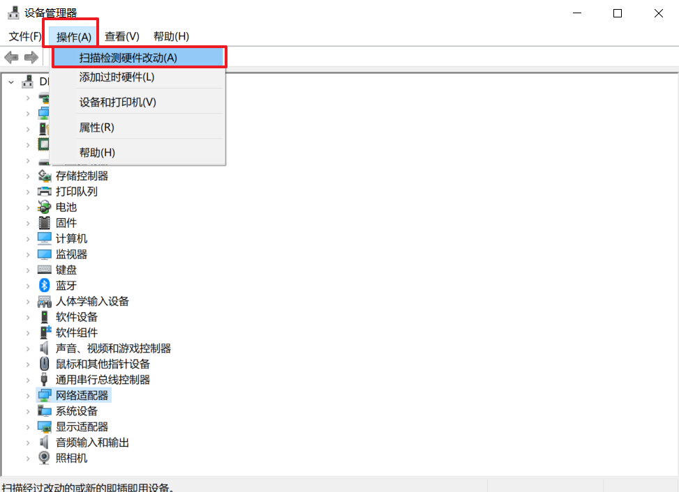 5、 随后,点击设备驱动器页面上方的“操作”-“扫描检测硬件改动”
