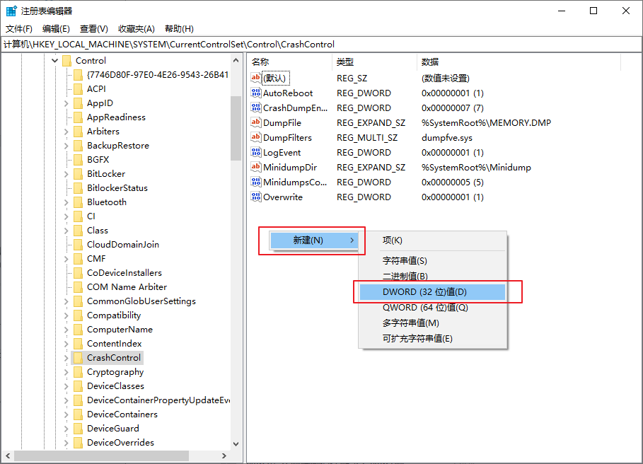 3、 先点击CrashControl,之后在右侧窗口右键选择“新建一个DWORD(32位)值”,命名为DisplayParameters