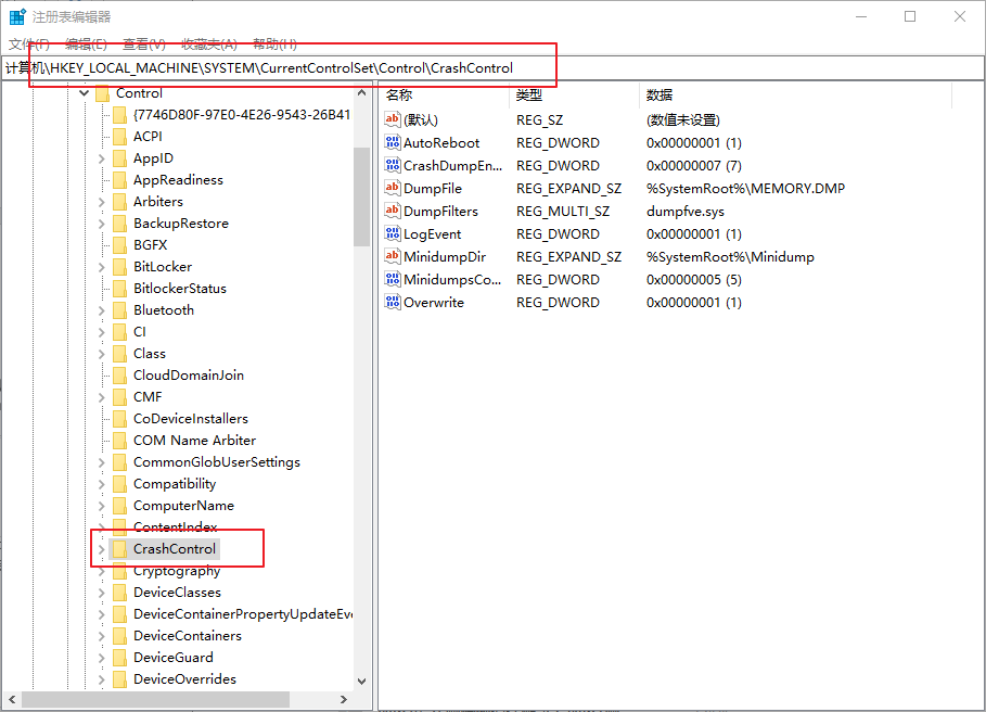 2、在注册表编辑器中,依次展开“\HKEY_LOCAL_MACHINE\SYSTEM\CurrentControlSet\Control\CrashControl”