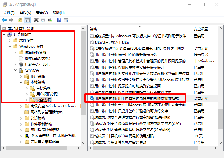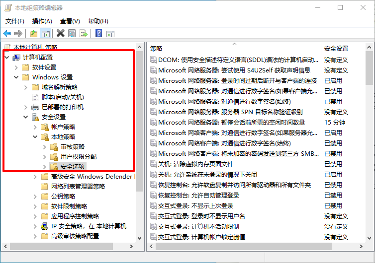 2、弹出本地组策略编辑器后,依次点击【计算机配置】→【Windows设置】→【安全设置】→【本地策略】→【安全选项】
