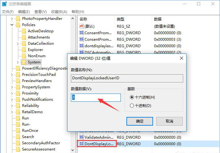 4、双击DontDisplayLockedUserID的DWORD(32位)值,将数值数据改为【3】即可。