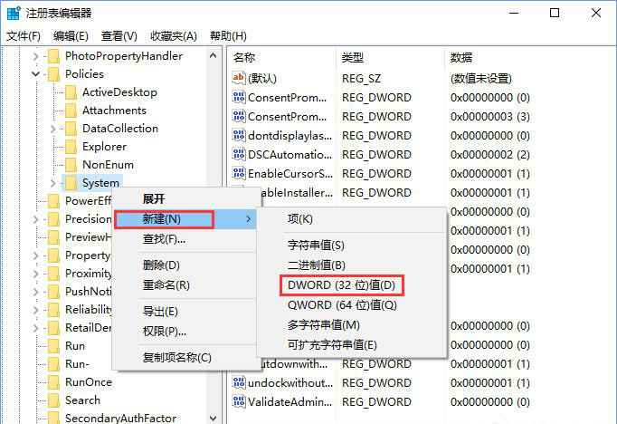 3、在左侧找到并右键System项,选择【新建-DWORD(32位)值】,并将该值命名为【DontDisplayLockedUserID】。