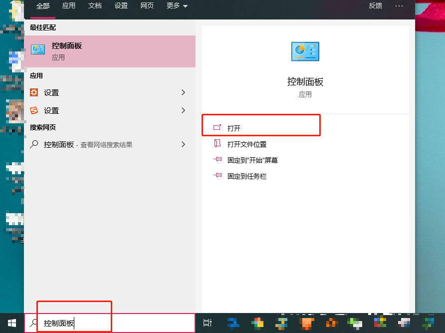 1、在桌面搜索框输入并打开“控制面板”;