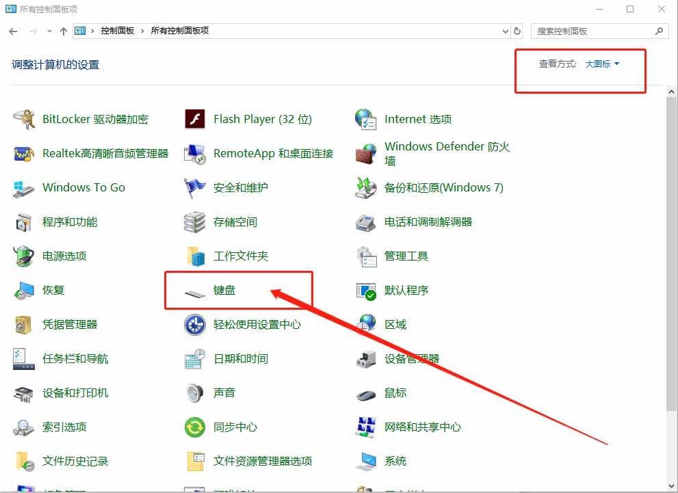 2、打开控制面板后,先将查看方式设置为“大图标”,找到“键盘”并点击打开;