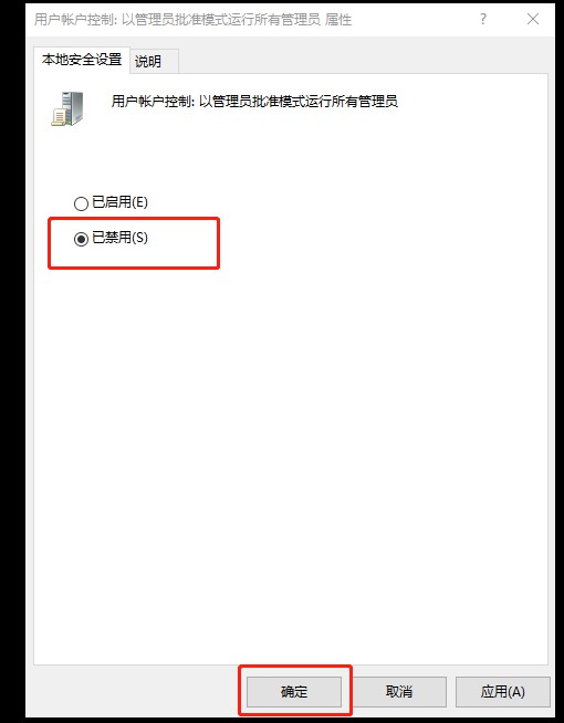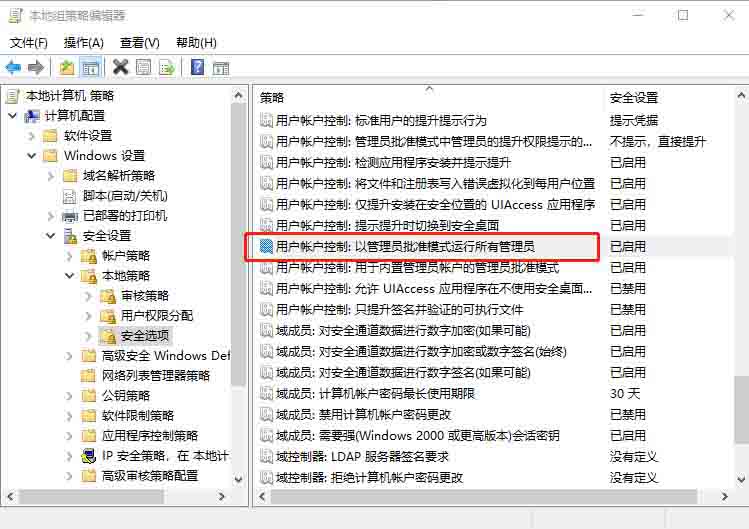3、在右侧找到并双击打开【用户账户控制:以管理员批准模式运行所有管理员】,选择【已禁用】点击确定;