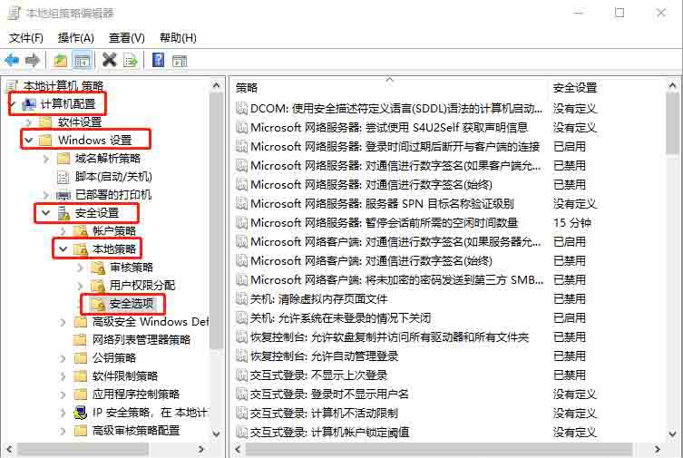 2、在组策略左侧,依次展开【计算机配置→Windows设置→安全设置→本地策略→安全选项】;