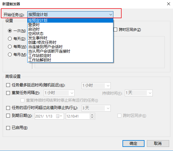 5、在新建触发器页面, “开始任务”下拉菜单中,可以选择任务执行的时间频次,;在也可以自定义特定时间,设定截止日期等,比如每天中午12点清理回收站,可按照下图设置,点击“确定”即可