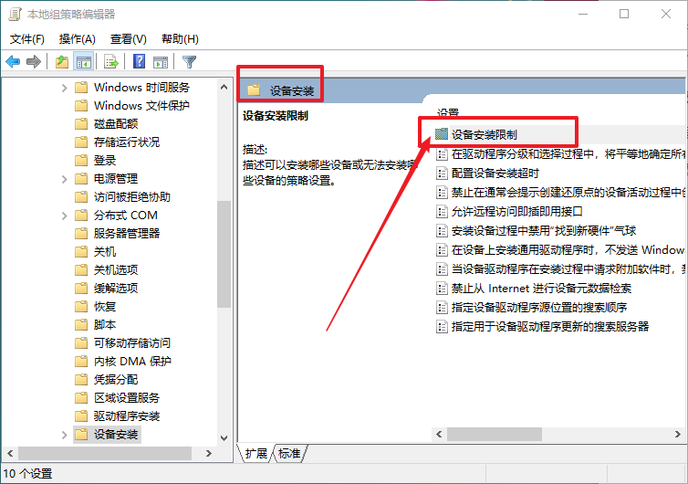 3、 点击系统文件夹后,在右侧找到并双击打开“设备安装”文件夹,再继续打开“设备安装限制”