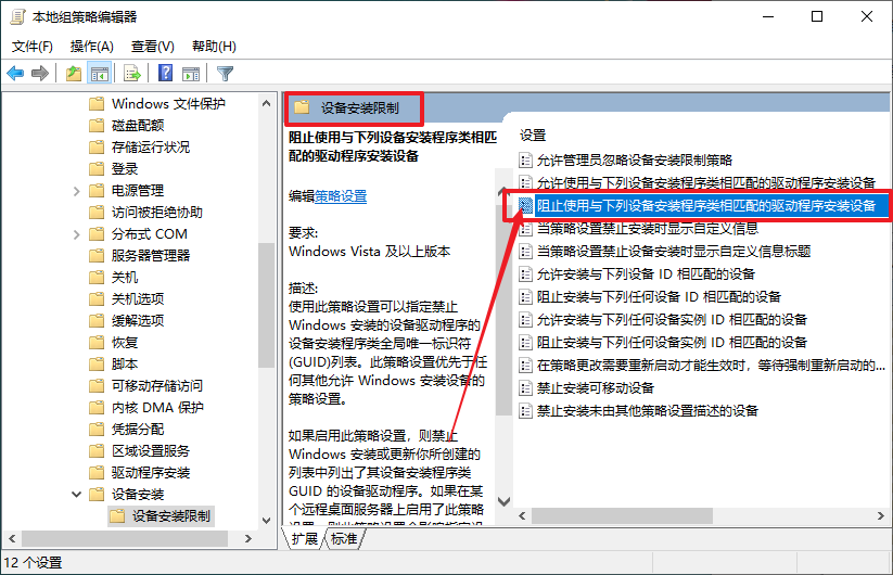 8、注意:设置之后,该设备的驱动更新就无法安装上去了,如果之后要更新这个设备驱动,需要在组策略编辑器中取消这个设备的限制,否则无法安装