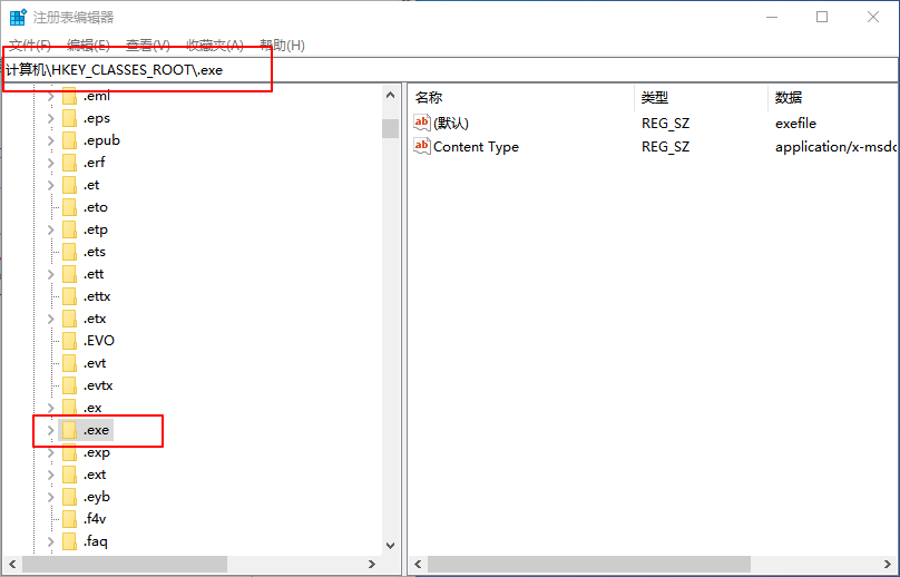 2、以可执行文件.exe为例,定位到:HKEY_CLASSES_ROOT\.exe