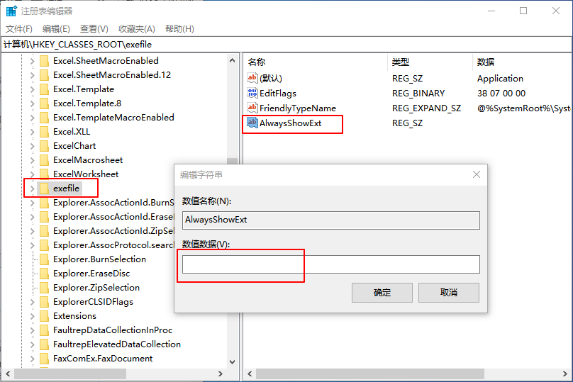 5、新建字符串值,命名为AlwaysShowExt,数值数据留空,最后重启文件资源管理器即可;