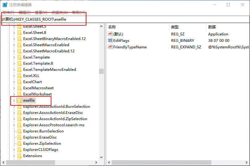 4、由上一步获取的数据,推导出以下位置:HKEY_CLASSES_ROOT\exefile;