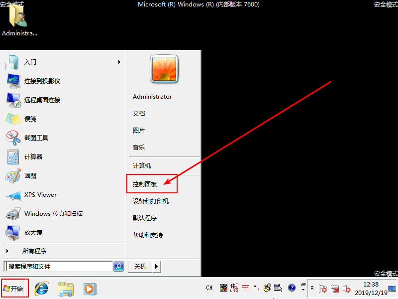 1、 在安全模式桌面中,点击“开始”菜单,选择“控制面板”
