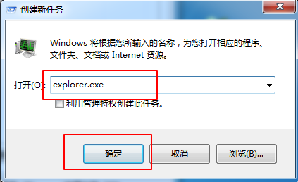 3、之后在新建任务窗口中输入“explorer.exe”,点击“确定”即可