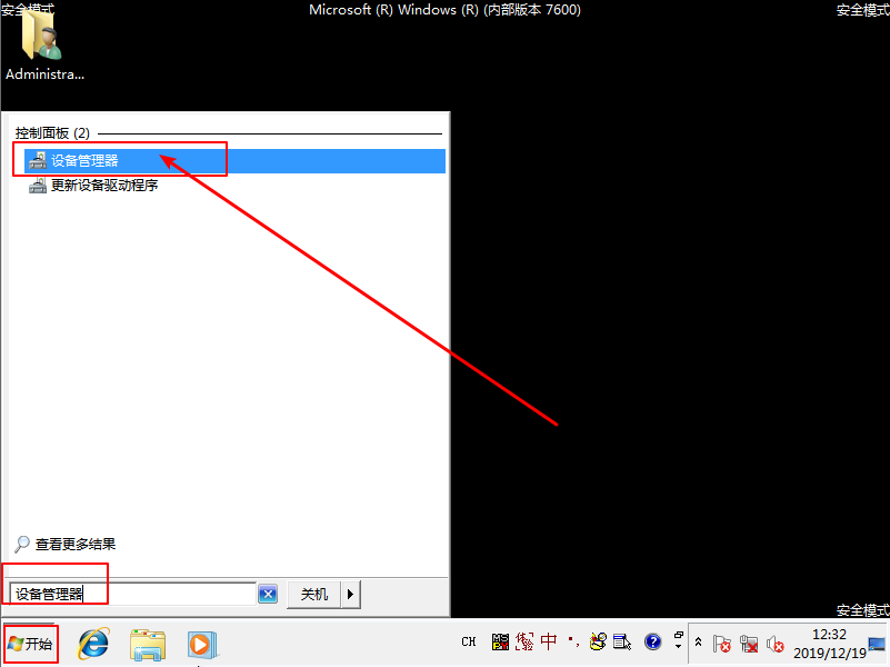 1、 进入安全模式的桌面后,点击“开始”菜单,在搜索框中输入并打开“设备管理器”