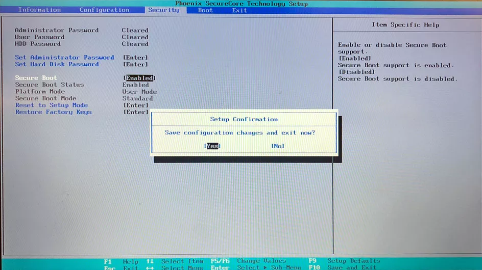 3、再移动至【BOOT】界面的【Boot Mode】,选择【UEFI First】。随后,切换至【Security】界面的【Secure Boot】,最后按下【F10】并回车即可