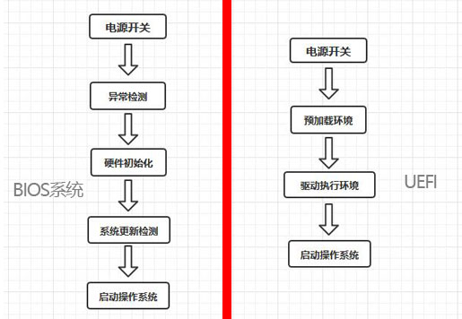 电脑的BIOS启动和UEFI启动流程还是有比较大的差别的,具体的概念就暂时不唠叨了,通过下面对比图,可以知道UEFI引导方式,开机会更快。