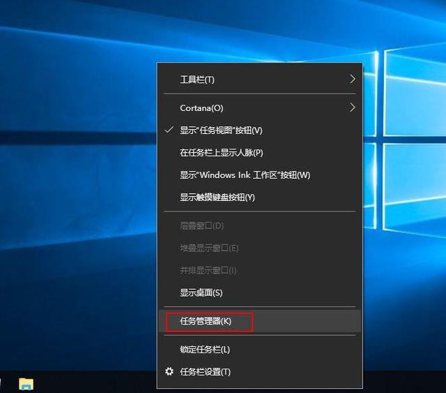 - 右击任务栏任一地方,选择“任务管理器”菜单。