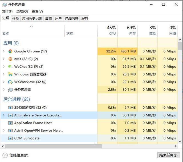 默认情况下,列表分为应用程序和后台进程,它们每分每秒都在不停地更新,建议可以观察几分钟,查找高内存或者CPU使用率高的进程,选择你认为降低性能的进程,点击“结束任务”进行关闭。