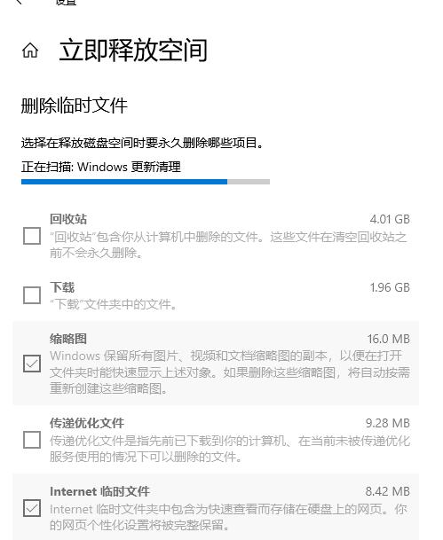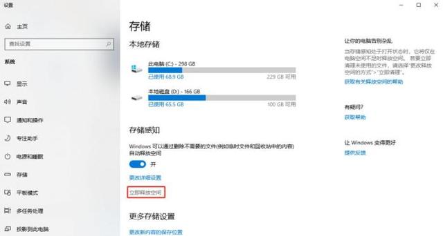 - 在“存储设置”里面点击“立即释放空间”,系统即可快速扫描磁盘无用文件进行清理,是不是又方便又快捷?