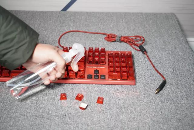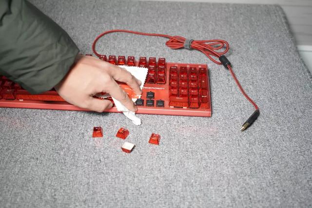 接下来磕掉、擦掉、用吹风机吹掉键帽下方的灰尘,不干净的地方用棉签沾酒精擦拭,注意不要把灰尘吹到主板上,酒精也不要沾到主板。