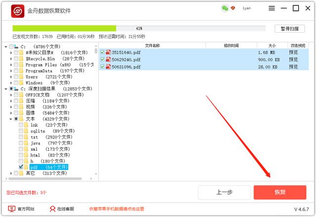 第四步、选择完需要恢复的文件后,点击“恢复”即可,无需等待扫描结束后。