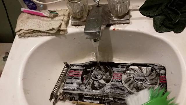 对于重度积灰的显卡,身经百战的矿卡,矿老板会直接拆掉散热器水洗,水洗也不会直接用自来水,一般是采用纯净水,因为自来水的水垢较多,在水洗风干之后可能残留水垢,虽然水垢在固态状态下不会导电,但是在高湿度的暴雨天,极有可能发生短路。这也是部分水洗显卡会发生"风湿"的原因。