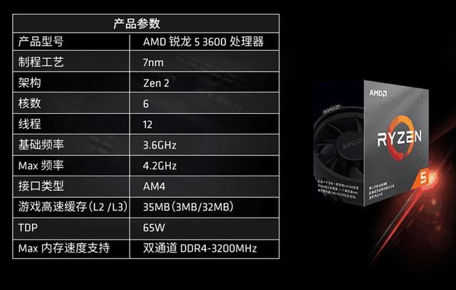 AMD锐龙R5 3600基于台积电7nm工艺制造、核心架构是Zen 2架构,相对上一代有着15%的IPC提升。规格上,六核心十二线程设计,这点跟上一代R5 2600一样。