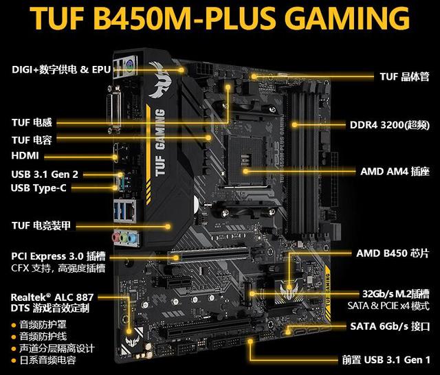 给R5 3600搭配的主板是华硕 TUF B450M-PLUS GAMING 电竞特工,定位于中端主板。如果想要发挥出CPU的PCIE 4.0这一属性就只有上X570的主板了,不过这个价位上X570没有必要。