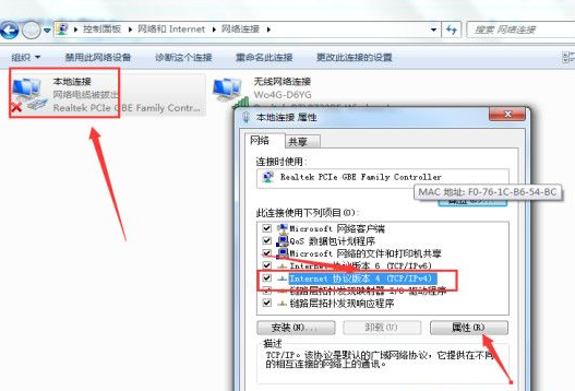 2、打开页面,找到“本地连接”,右键点击“本地连接”,选择“属性”选项,在弹出的窗口中选择“Internet协议版本4”,点击“属性”。