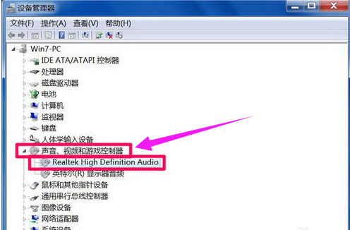 二、打开“声音,视频和游戏控制器”,看下面的声音设备前面有无黄色警示标志,若有就表明驱动损坏,就要更新驱动了。