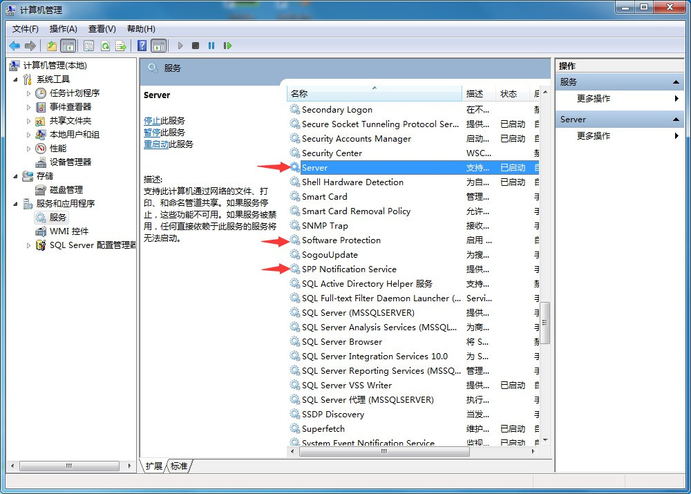 步骤二:启动Server、SoftwareProtection、SPP Notification Service三个服务,如果已启动,右键重新启动