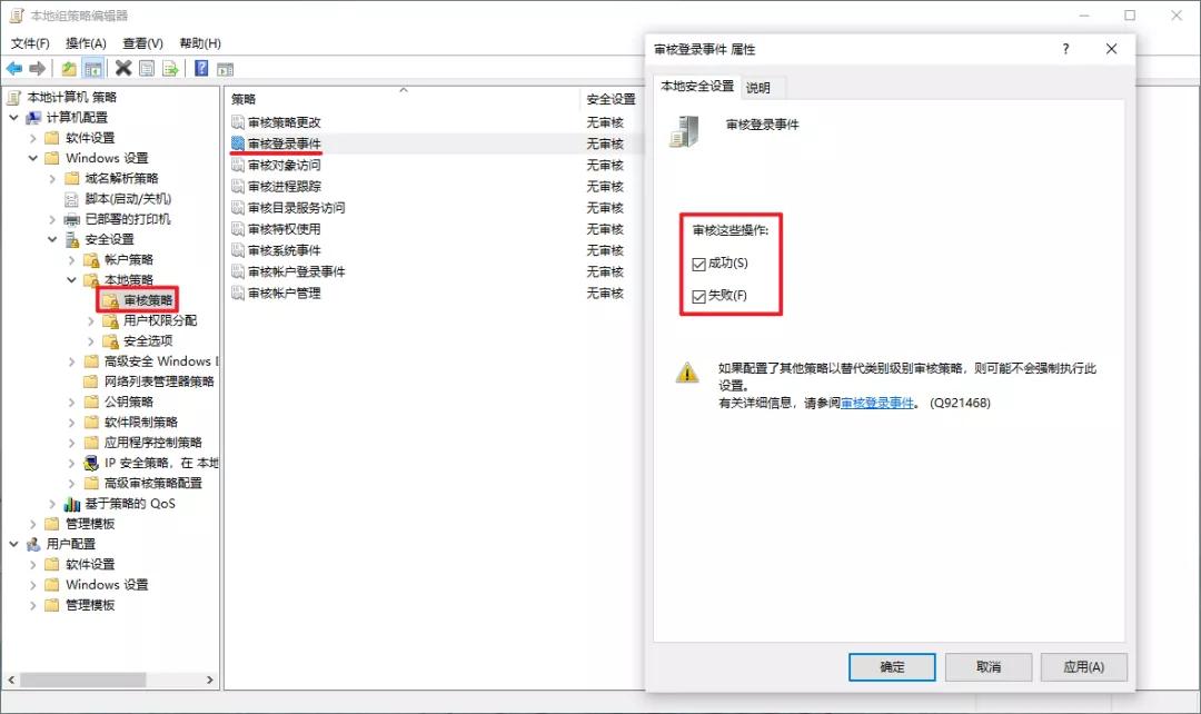 在右边找到「审核登录事件」并双击打开,勾选成功和失败,这样在电脑开机后不管是否登录进入桌面,Windows 都会将其记录到安全日志中。