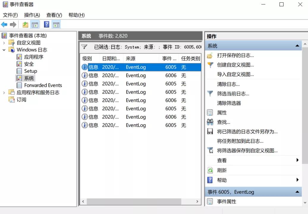 最后在筛选器界面的ID框中输入6005(开机时间),6006(关机时间),用英文逗号隔开,点击确定就可获知开机记录了。