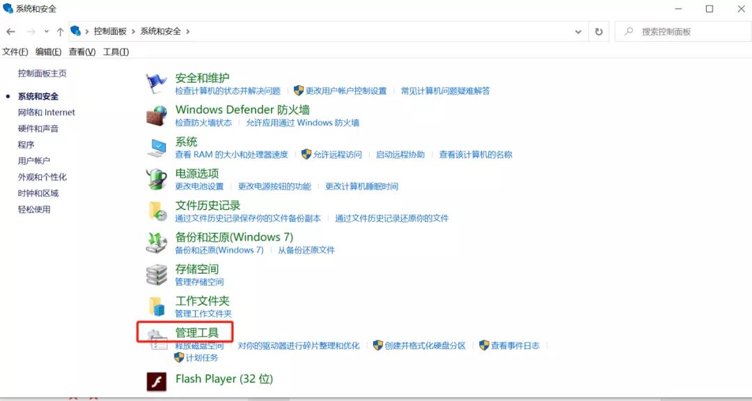 首先打开电脑的菜单键(开始键),然后打开控制面板,选择“系统与安全”,点击“管理工具”。