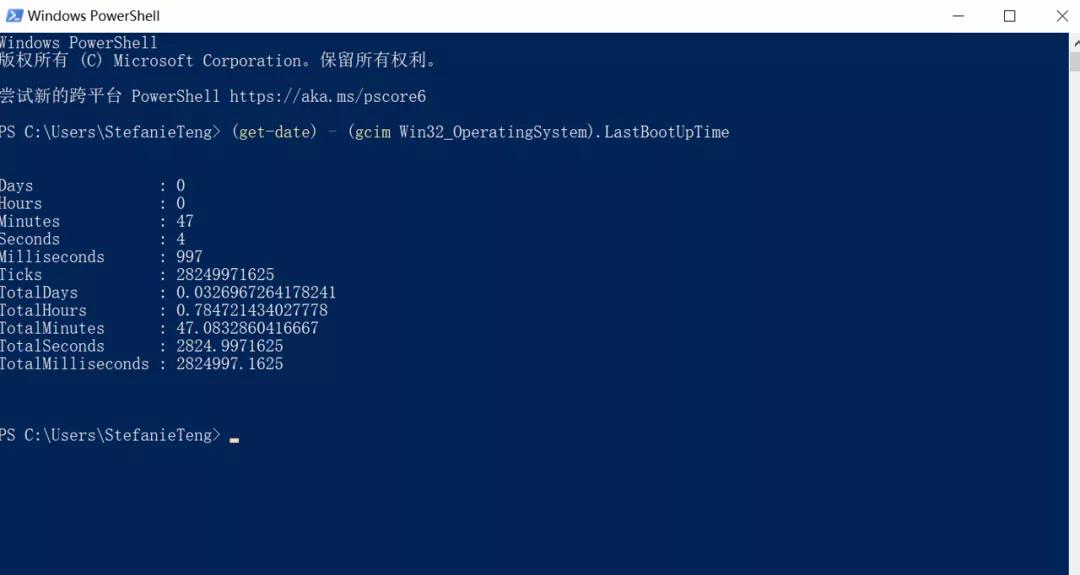 又或者可以直接按下键盘快捷键【Win+R】,在弹出的对话框中输入指令“Powershell”,接着输入“(get-date) - (gcim Win32_OperatingSystem).LastBootUpTime”并回车,此时就可以看到开机运行时长了。