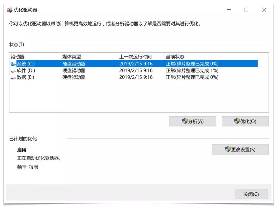 多久整理优化一次碎片?上图中,我设置的是每周自动优化一次,对于个人电脑而言还是要看使用频率,像我这种使用电脑频率高的一周优化一次是没什么问题的,如果你使用电脑频率不是那么高,也可以设置1月或3月优化一次。长时间运行的服务器可以设置1周或1月优化一次。