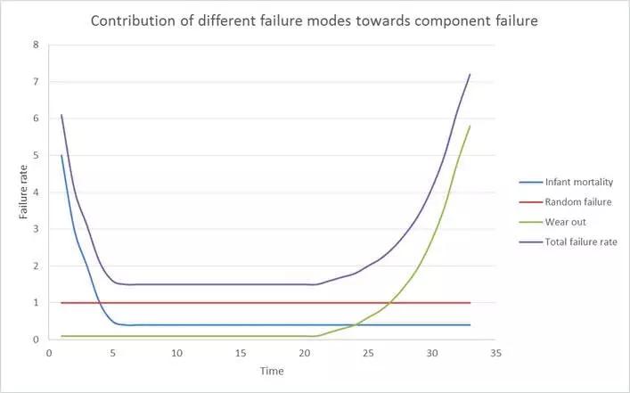 绿线为「耗损失效期」,也就是大家通常理解的「使用老化」,前期都非常低,但是随着使用时间增加,错误率会显著提高。