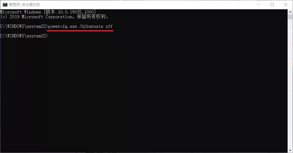 3. 输入 powercfg.exe /hibernate off,然后按 Enter。