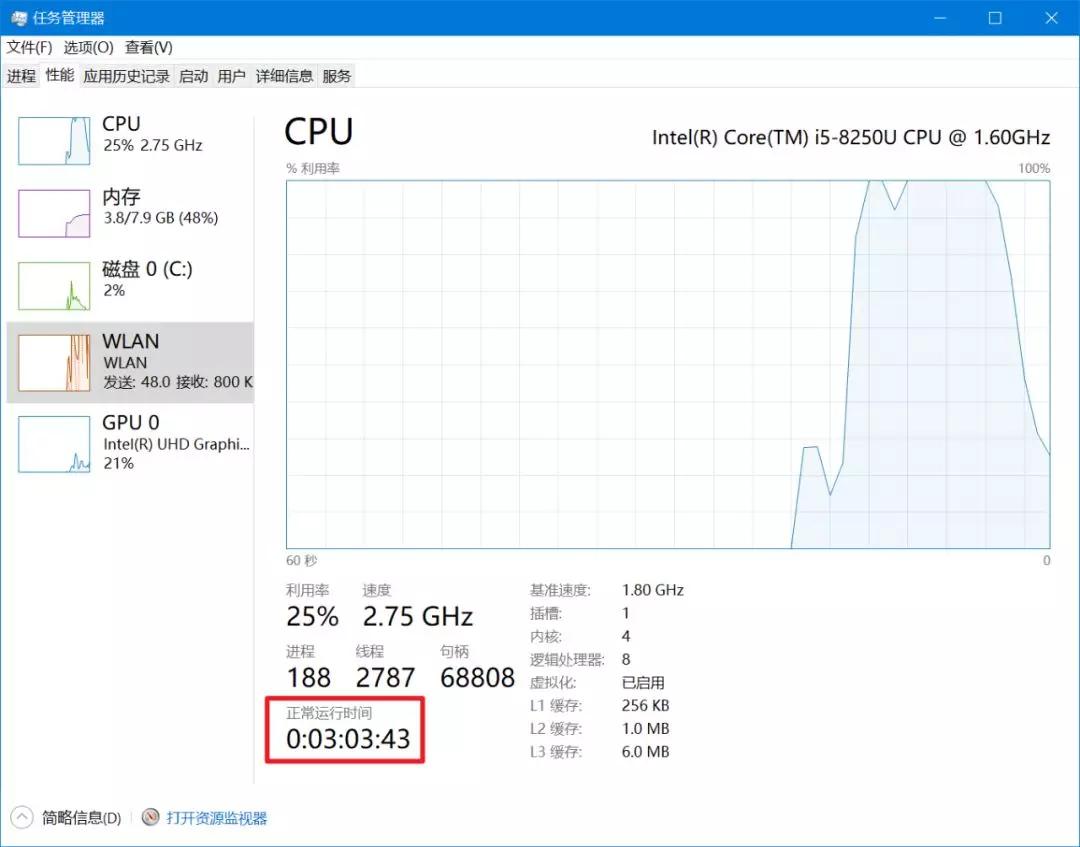 你可以在「任务管理器」中查看电脑是否使用了「快速启动」,如果是完全关机重启的话「正常运行时间」会被重置,而「快速启动」则会保留运行时间。