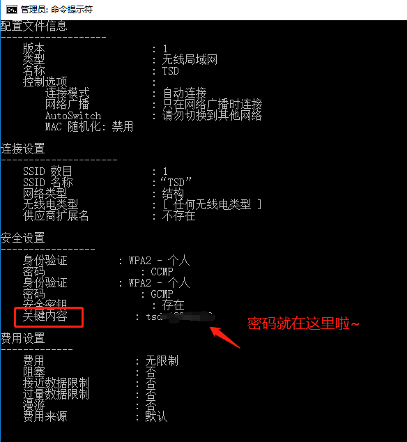 在命令提示符模式下,输入命令Netsh wlan show profile name=”热点名字” key=clear。例如我输入的是Netsh wlan show profile name=”TSD” key=clear,TSD是我已经连接的WiFi名字~