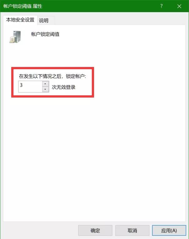 3. 首先需要改动的是可输入密码上限次数,双击“账户锁定阈值”项,修改一个自己需要的次数,然后确定保存;