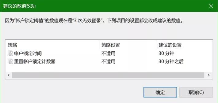 4. 这时系统会建议修改其他两项,“账户锁定时间”代表超过上限次数后会锁定账户30分钟,“充值账户锁定计数器”代表30分钟后账户锁定功能将重置,也就是解除锁定;